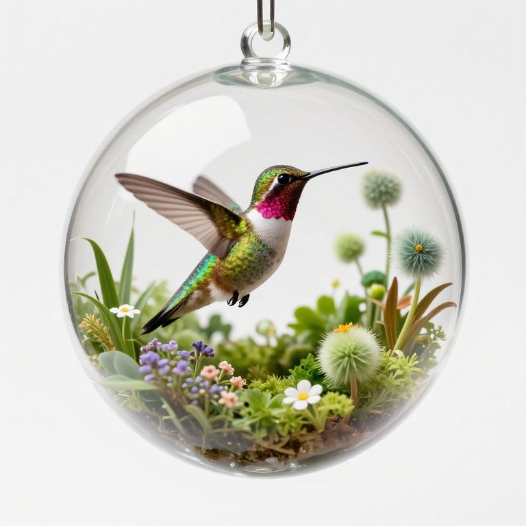 A hummingbird perches serenely within a suspended glass globe, its vibrant plumage contrasting against a miniature ecosystem of lush greenery, delicate flowers, and whimsical puffball plants, defying gravity in a surreal, enchanted microcosm.