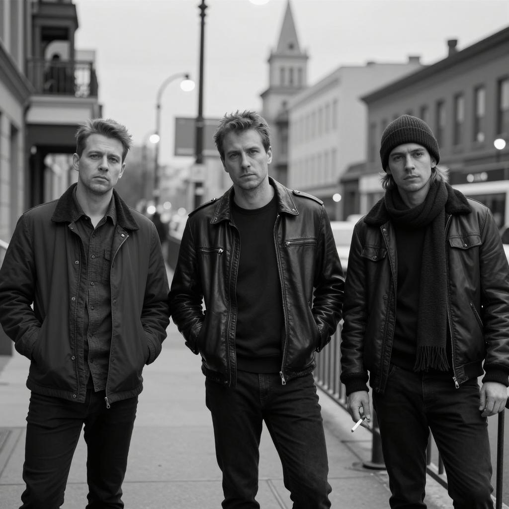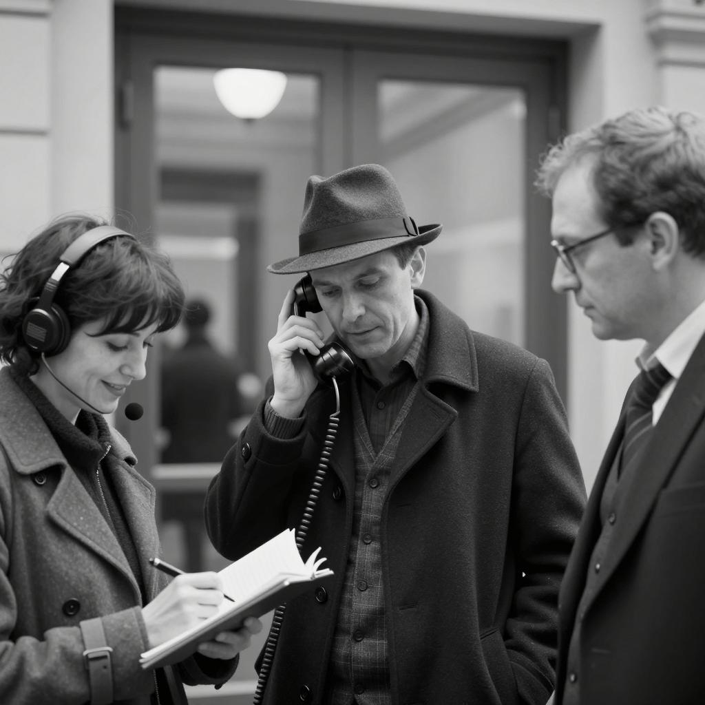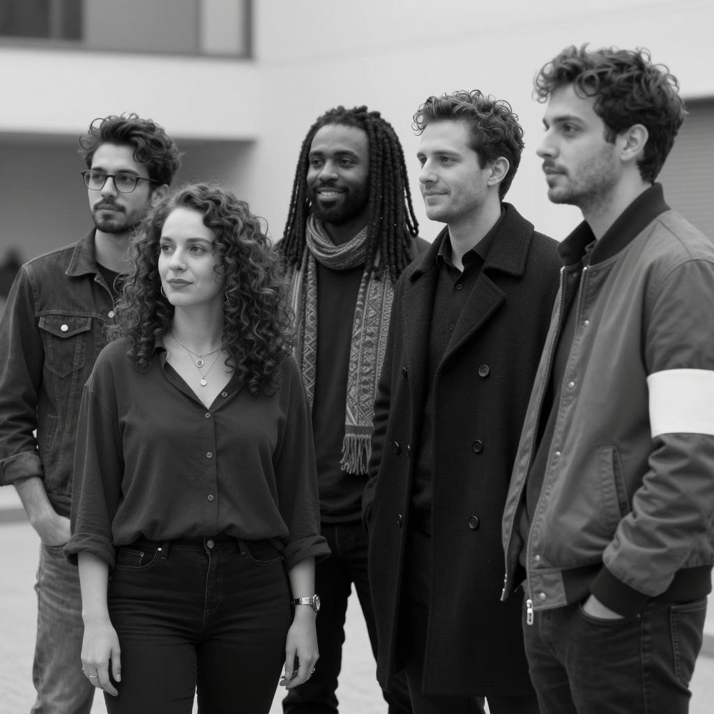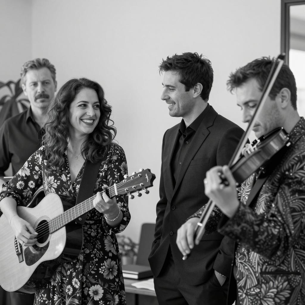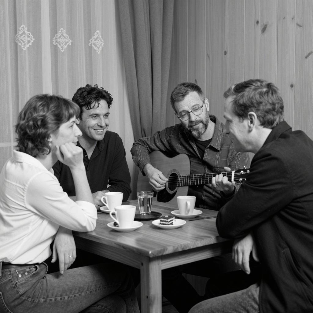 Black-and-white photograph of four people sitting around a table. Woman on left with short hair, wearing a white blouse, rests chin on hand. Man next to her with dark hair, smiles. Middle-aged man with beard and glasses plays acoustic guitar. Man on right with short hair, wears dark jacket, leans forward. Table has cups, a small plate, and a glass. Background has patterned curtain and wooden wall.