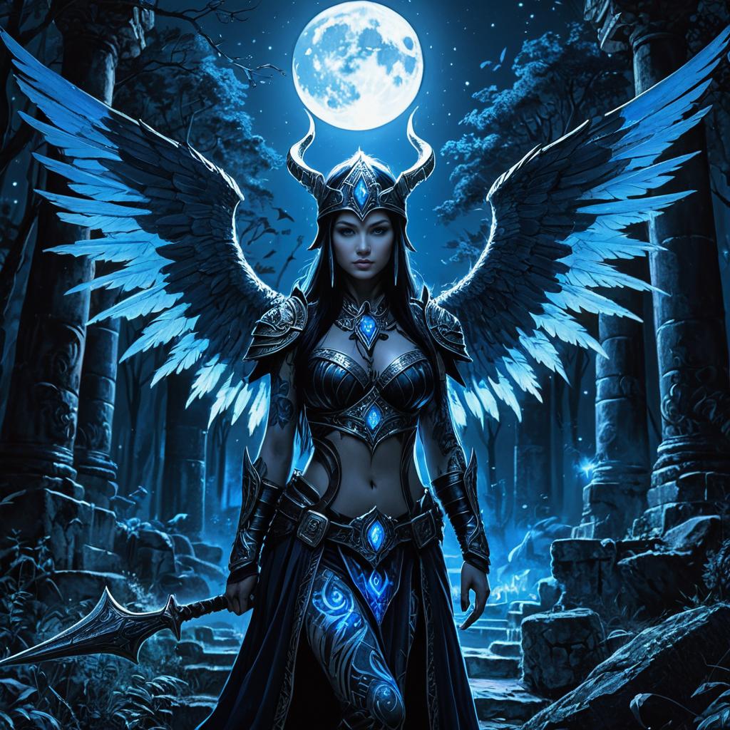 Full character portrait of a fierce Valkyrie warrior featuring glowing rune tattoos and intricately designed celestial armor. The armor is detailed with icy blue and silver elements, including a winged helm and shoulder plates. The warrior has long white hair and piercing blue eyes, set against a dark, snowy background creating a mystical Nordic fantasy atmosphere.