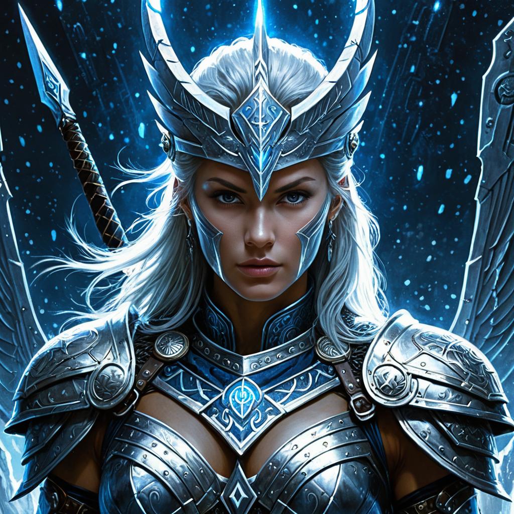 Full character portrait of a Valkyrie warrior with glowing rune tattoos and celestial armor, in the style of Donato Giancola, Boris Vallejo, Michael Whelan, Yoshitaka Amano, nordic fantasy, icy blues and silvers, concept art, ultra-high-definition
