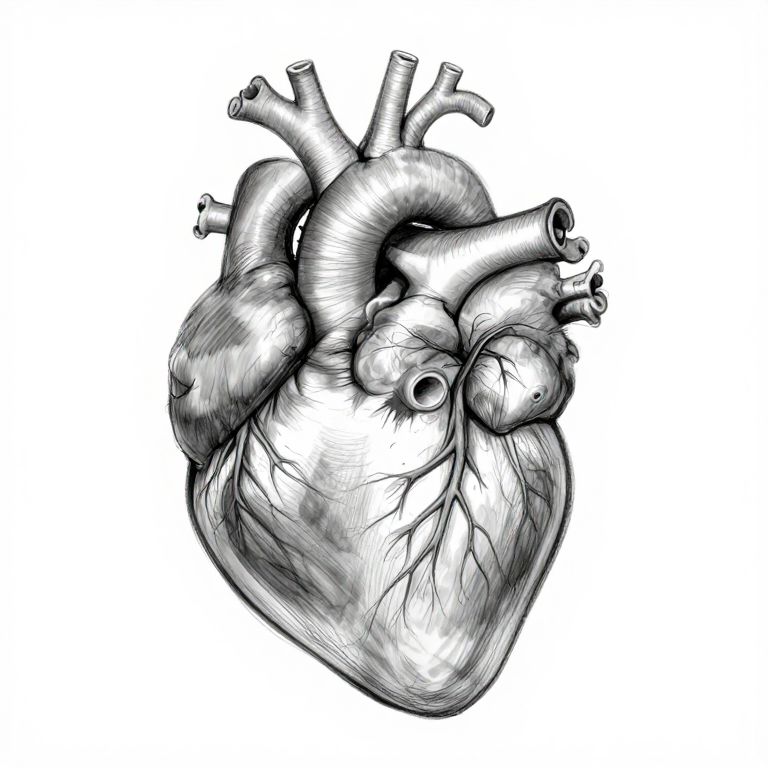 Monochrome black and white heart diagram showing detailed cardiovascular system, artistic blend of scientific and sketch styles, emphasizing heart valves and arteries on a plain white background