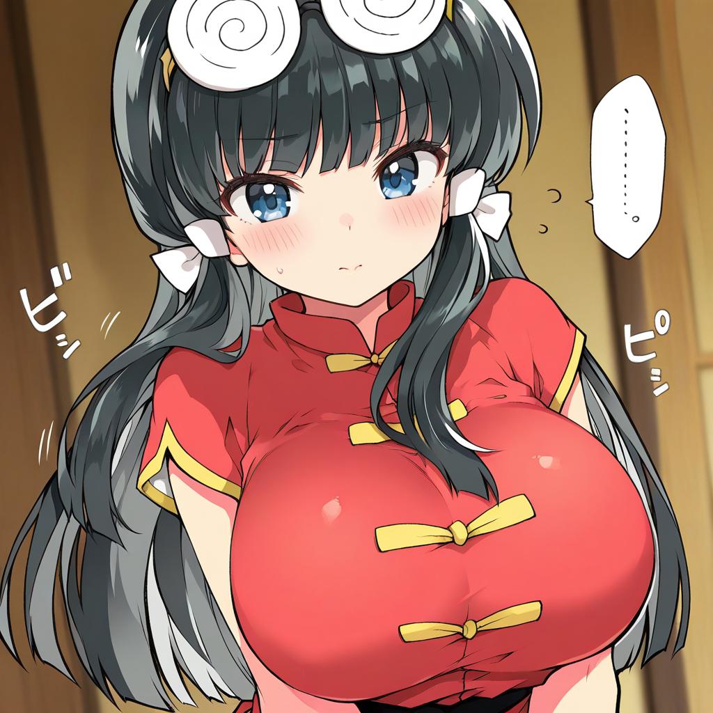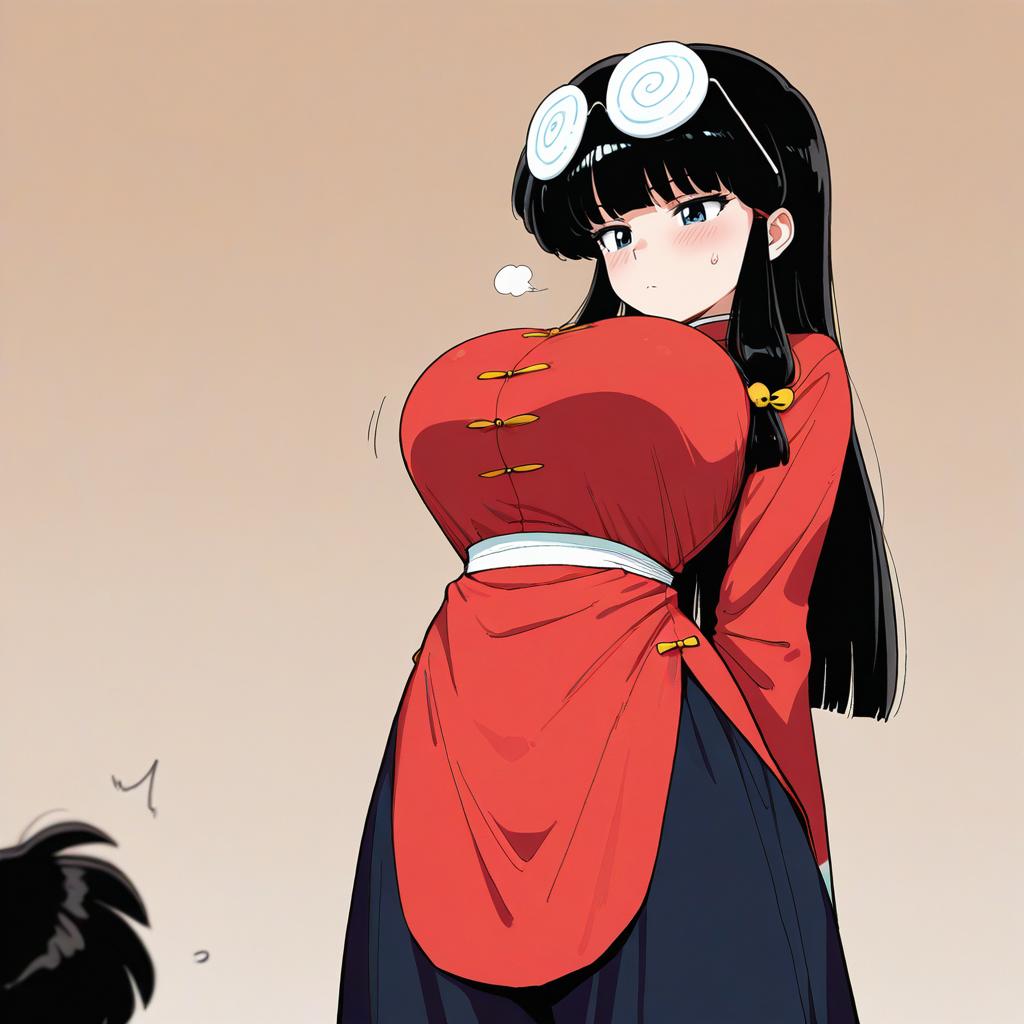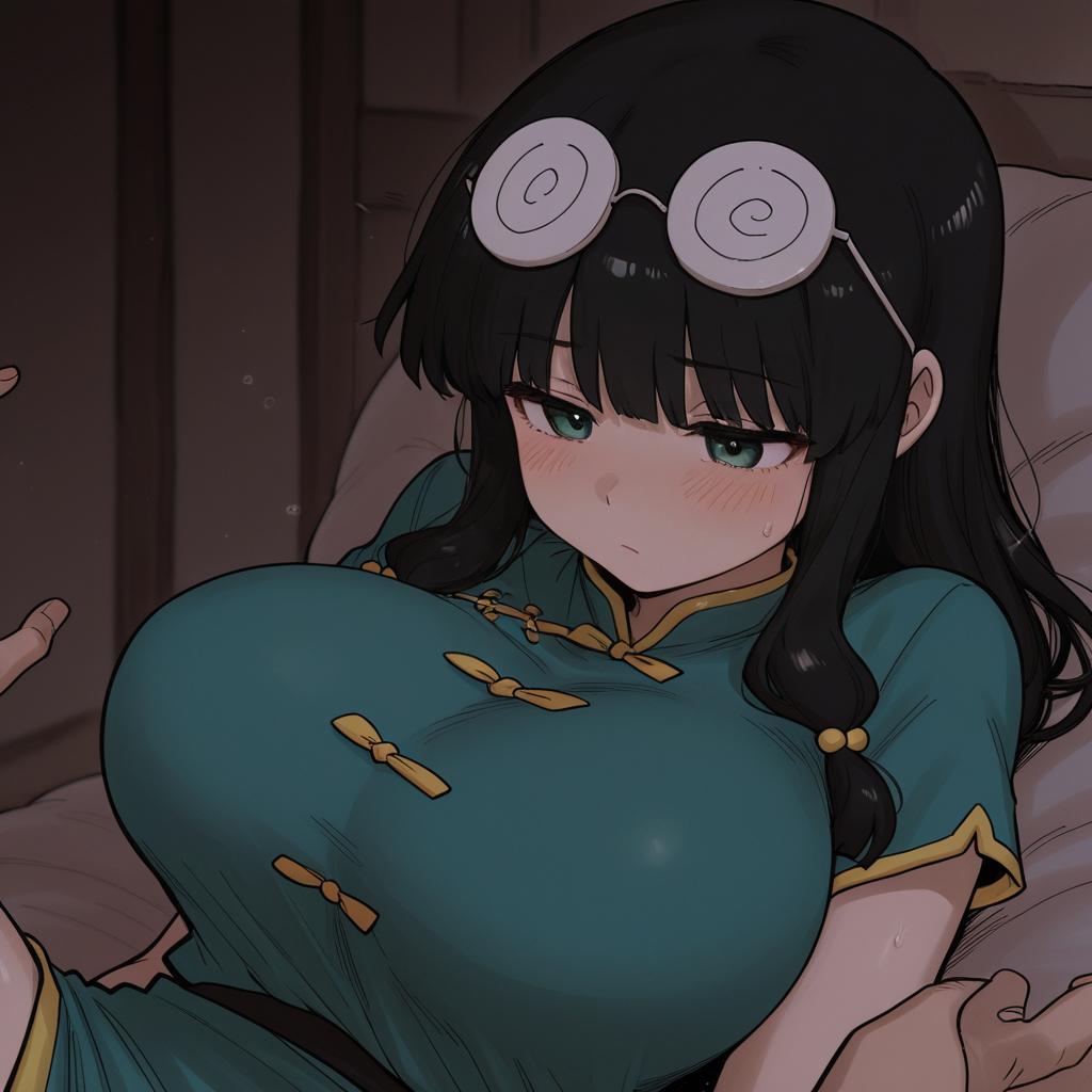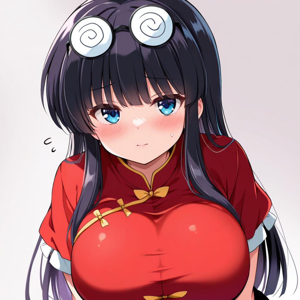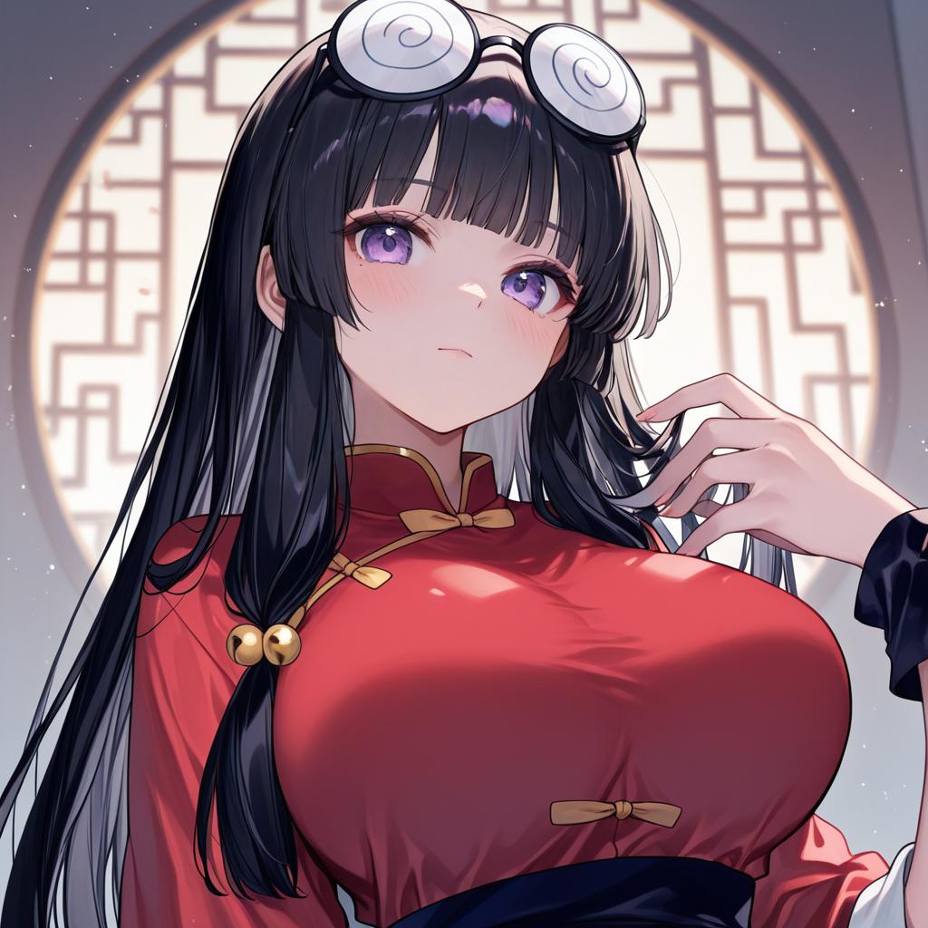 Mousse (ranma 1/2), ranma 1/2, 1girl, coke-bottle glasses, eyewear on head, long hair, black hair, blunt bangs, huge breasts, chinese clothes, chinese clothes, by artist huqu, illustrious