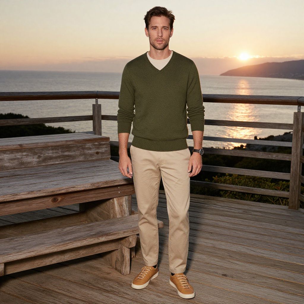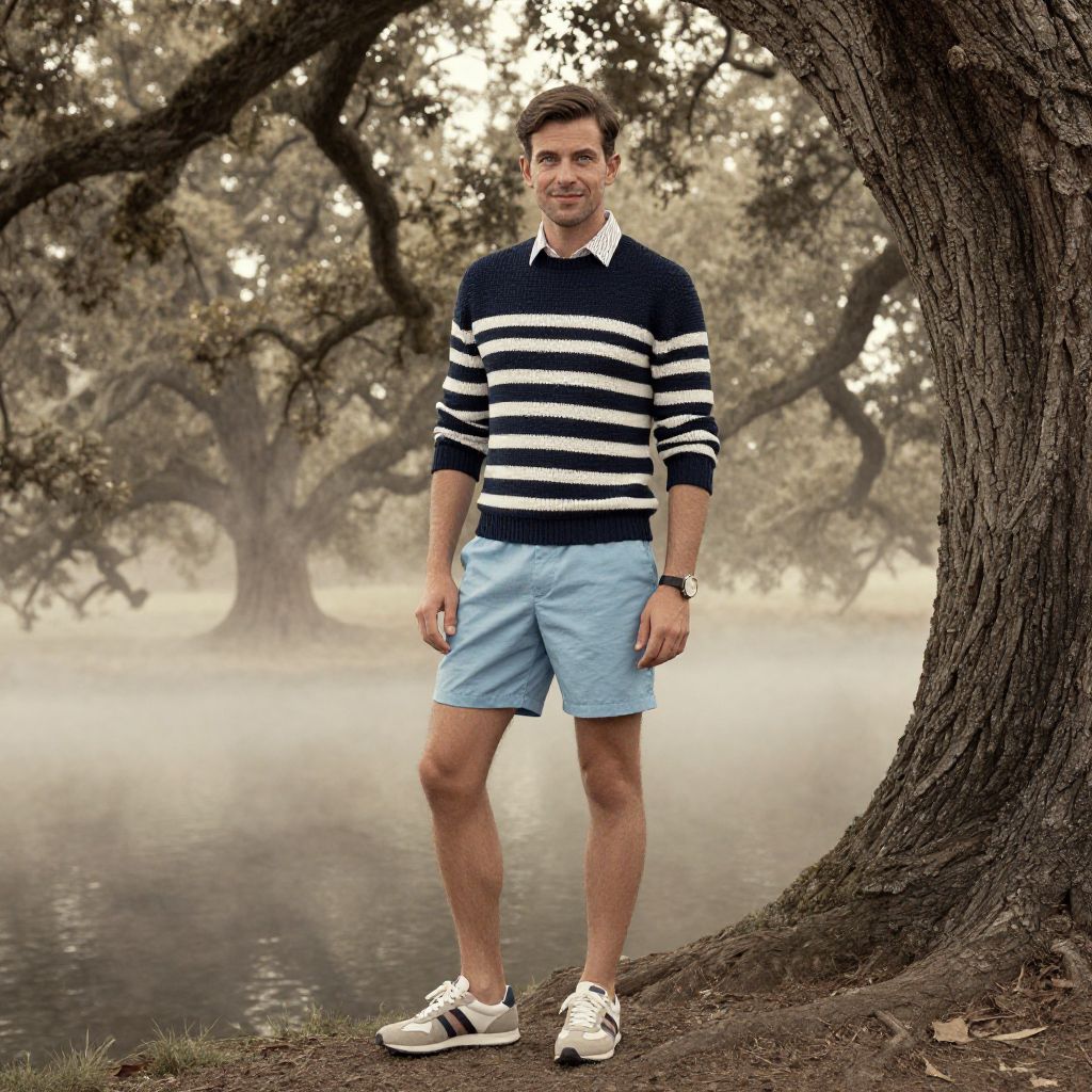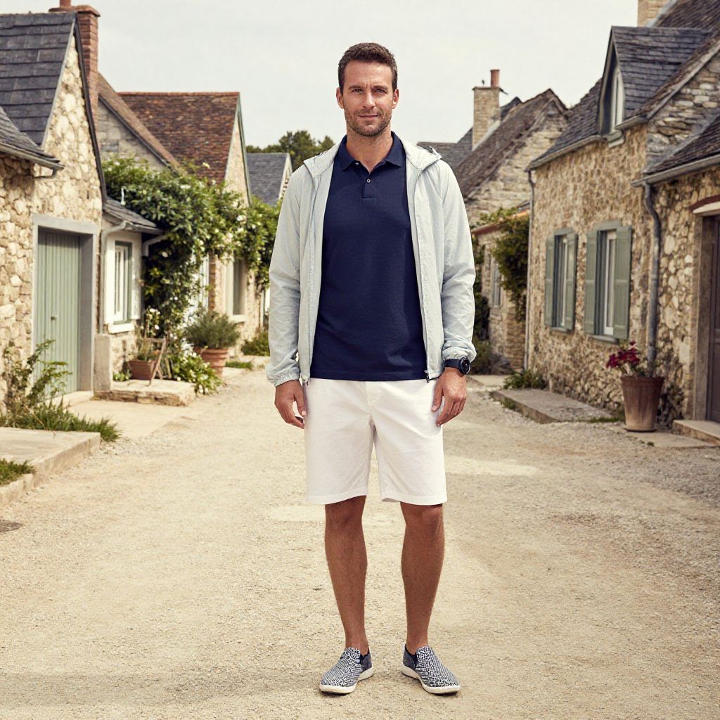 A man, light blue knit polo, beige pleated shorts, white canvas sneakers, summer vibe, charming alpine village, cobblestone paths, vintage photo style, relaxed smile, enjoying the scenery. Man has masculine face and piercing eyes