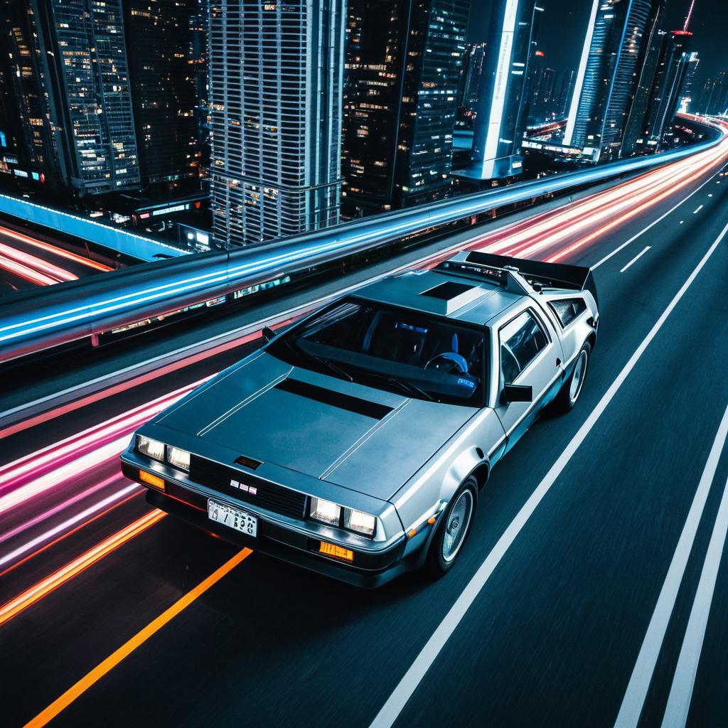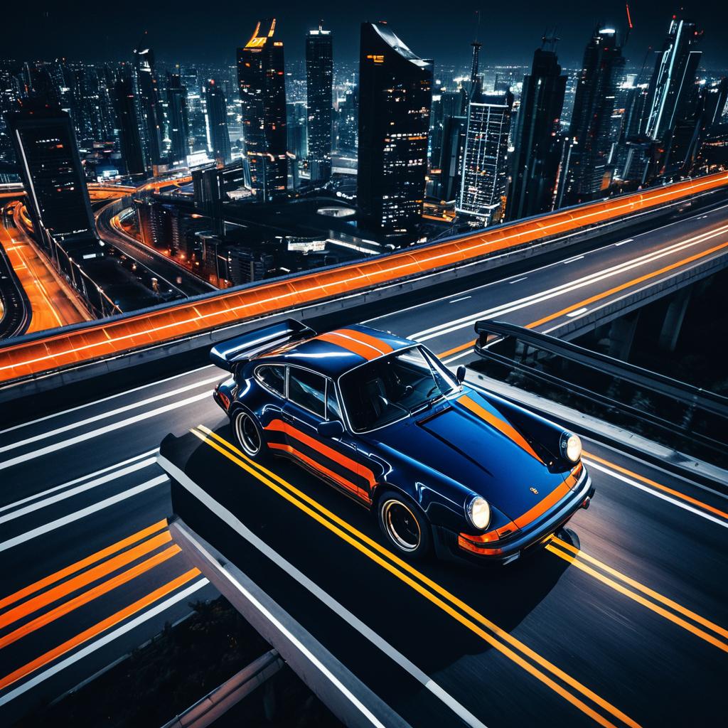 A 1969 Dodge Charger in black with vibrant orange racing stripes driving on a futuristic elevated highway surrounded by tall modern skyscrapers with neon lights. The photo captures dynamic motion with light trails using a drone and Dutch angle perspective against a night cityscape.