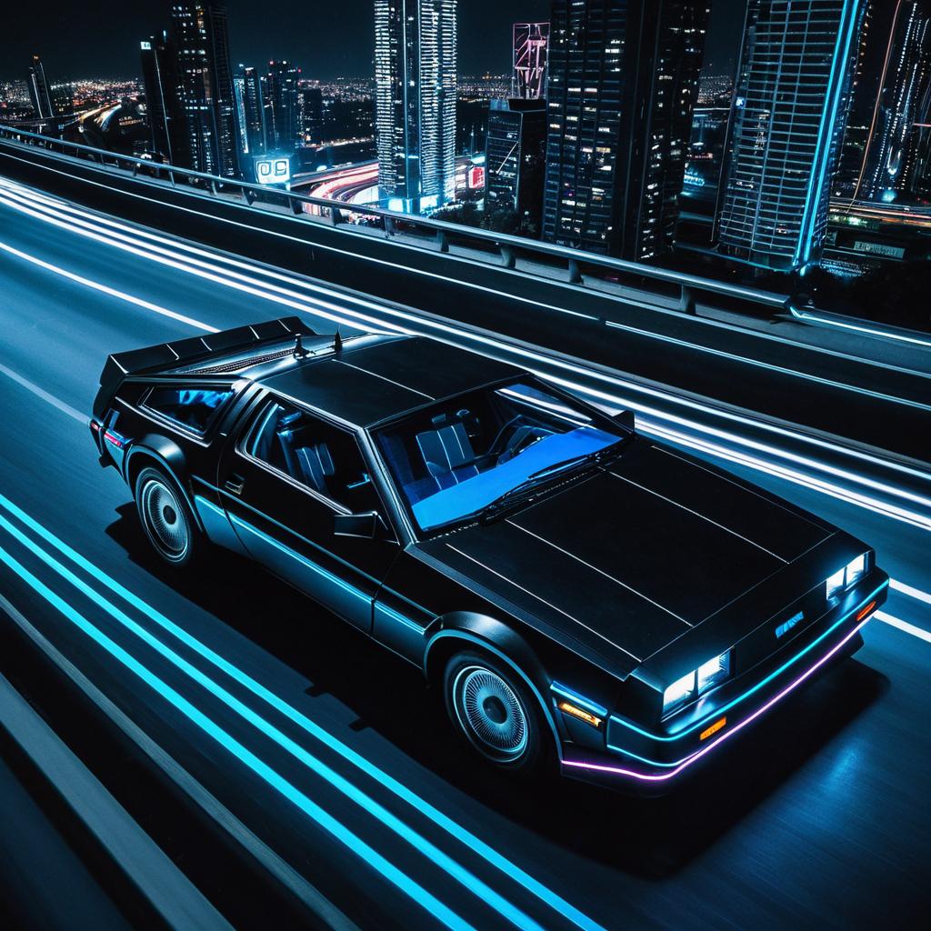 1969 Dodge Charger in a striking black with orange racing stripes, racing along a futuristic highway in an alien city, surrounded by towering skyscrapers and bright neon lights::5, the photo is taken from a drone with a Dutch angle, adding a dynamic perspective to the composition