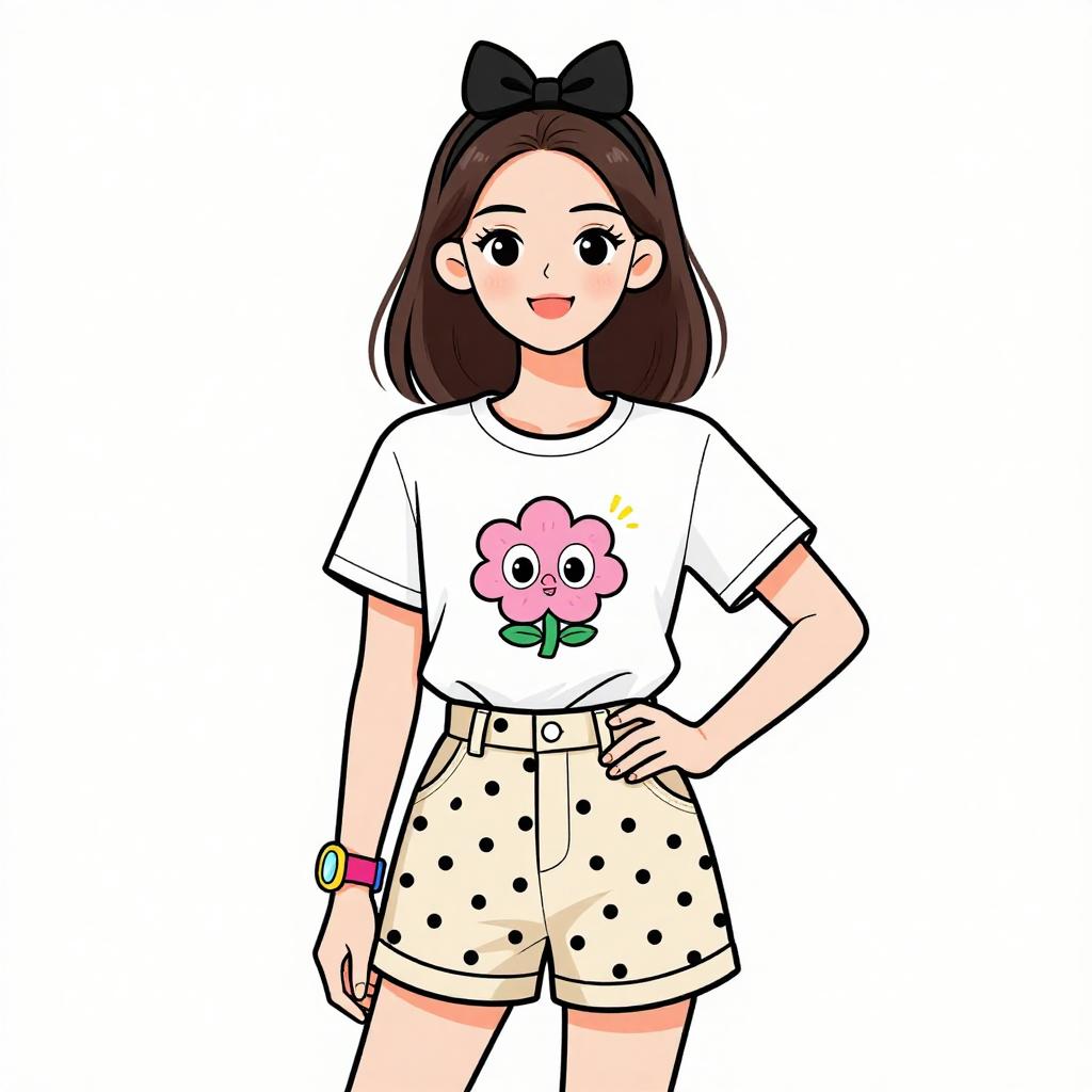 Woman with pretty face and pretty hair. smiling Woman, playful casual, white graphic t-shirt with pink cartoon print, round neckline, short sleeves, beige high-waisted shorts with black polka dots, pleated front, black hairband with bow, colorful wristwatch with wide band, standing pose, white studio background --sref 1467
