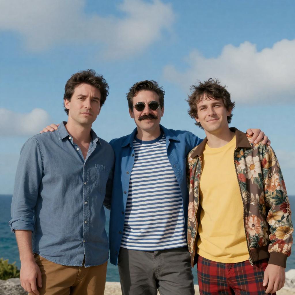 Photograph of three men in a tropical setting with palm trees. Left: dark-haired man in blue shirt, serious expression. Center: mustached man with sunglasses, blue jacket, leaning forward. Right: light-haired man in orange shirt, neutral expression. Background: clear blue sky, palm trees.