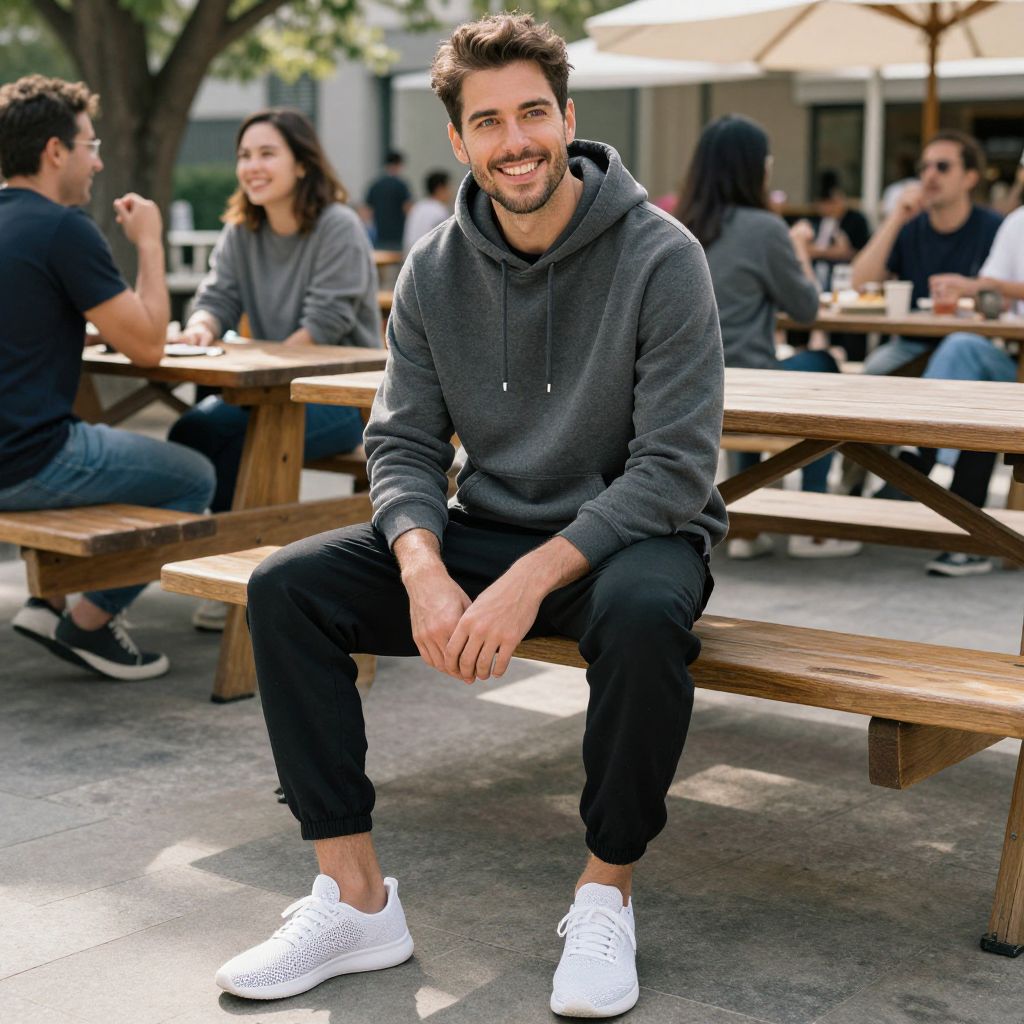 A man, soft cotton blend hoodie, charcoal gray, relaxed fit, moisture-wicking joggers, black, tapered leg, lightweight mesh sneakers, white, breathable fabric, sun-drenched plaza, wooden picnic tables, cheerful laughter and chatter, 3M ferrania analog film stock, relaxed smile, casual vibe.Man has masculine face and piercing eyes