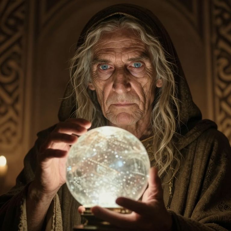 Photograph of an elderly man with long, unkempt gray hair and intense blue eyes, wearing a dark brown hooded robe. He holds a large, glowing, transparent crystal orb in both hands, illuminating his weathered face. The background is dimly lit with ornate, golden patterns, suggesting a mystical or historical setting. The light from the orb casts dramatic shadows on his face, highlighting his deep wrinkles and serious expression. The overall mood is magical and mysterious.