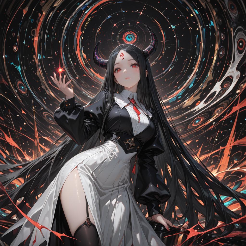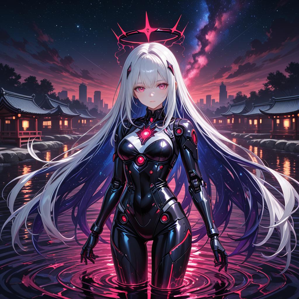 Masterpiece, best quality, ultra-detailed, very detailed illustrations, extremely detailed, intricate details, highres, super complex details, extremely detailed 8k cg wallpaper, cowboy shot, caustics, reflection, ray tracing, demontheme, nebula, dark aura, cyber effect, 1girl, solo, alone, mecha musume, mechanical parts, robot joints, single mechanical arm, headgear, mechanical halo, star halo, intricate mechanical bodysuit, mecha corset, kimono, full armor, very long hair, white hair, hair between eyes, multicolored hair, colored inner hair, red eyes, glowing eye, eye trail, random expressions, random action, ancient japanese architecture, pond, starry sky, skyline