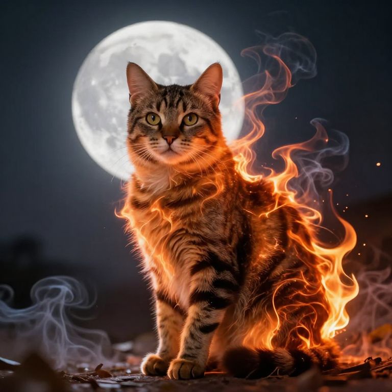 A majestic tabby cat sits serenely beneath a luminous moon, its fur aflame with swirling streams of fire, smoke, and ethereal energy, defying the boundaries of the natural world.