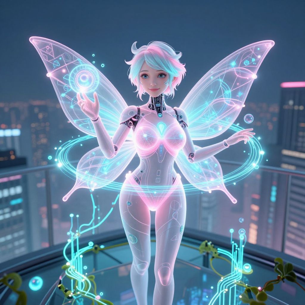 Digital art of a glowing, futuristic fairy with neon wings, cybernetic features, and a city skyline background at night.