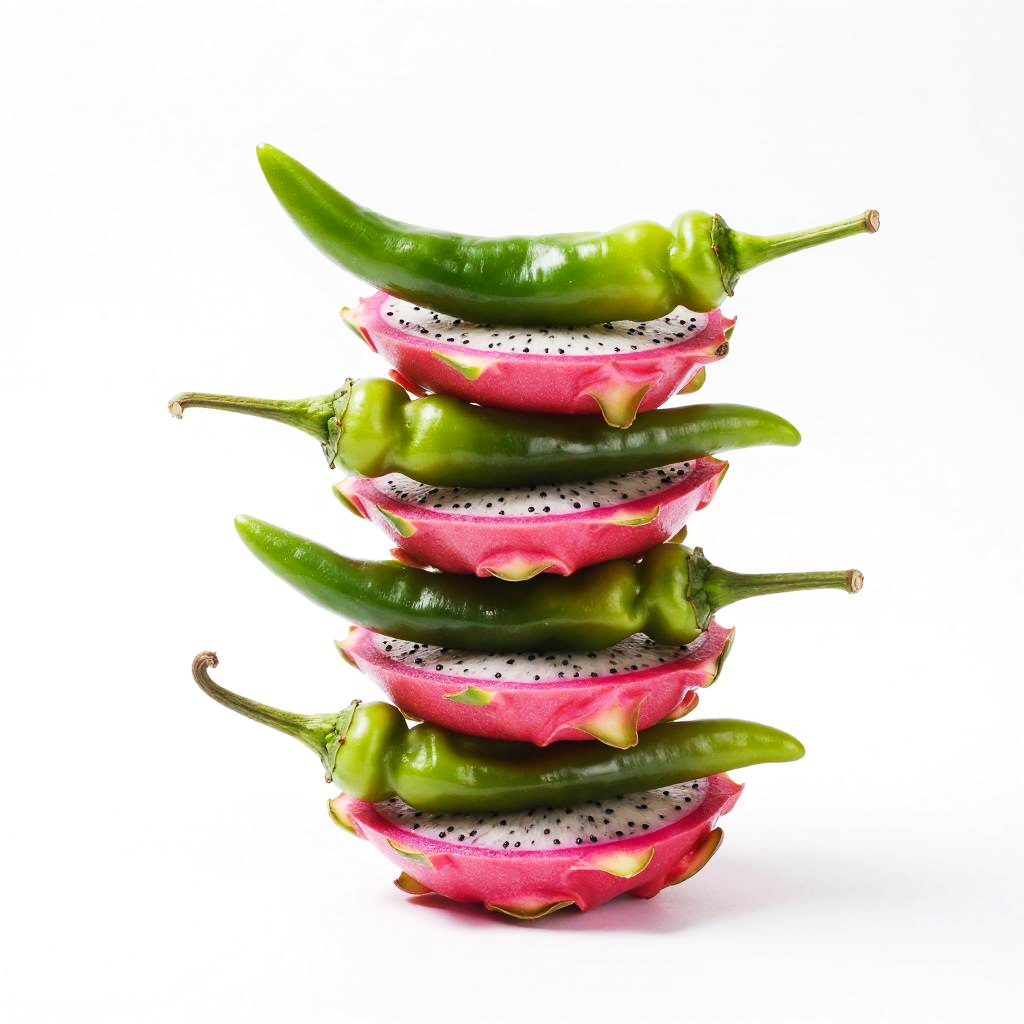 Vibrant Stack of Chili Peppers and Dragon Fruit
