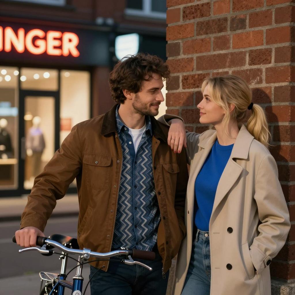 Two people in a car at night. Blonde woman with wavy hair, wearing a patterned shirt, eating a burger and fries, looking down. Man with dark hair, wearing a grey shirt, holding a 7-Up can, looking at her. Both in front seats. Blue car interior. Raindrops on window.