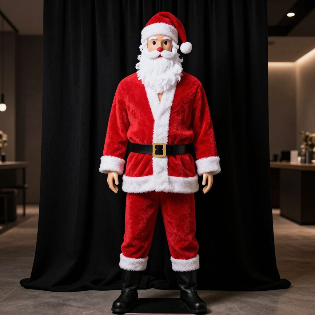 A detailed mannequin wearing a red and white Santa suit with a black belt and black boots, standing confidently in front of a dramatic black curtain. The mannequin has a classic, stylized Santa face with a red nose and white beard, giving it a festive yet elegant appearance. The scene is set in a dimly lit, modern interior with soft lighting highlighting the suit's textures and the contrast between the bright red and white of the outfit and the deep black backdrop. The mannequin is slightly tilted, as if posing for a photo, adding a sense of depth and character to the image.