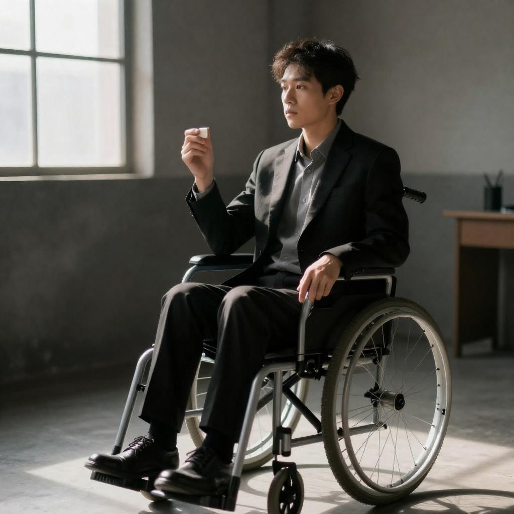 Man in a black suit and gray shirt sits in a wheelchair, holding a small object in his right hand. Dimly lit, industrial-style room with sunlight streaming through a window. Expression is focused. One person.