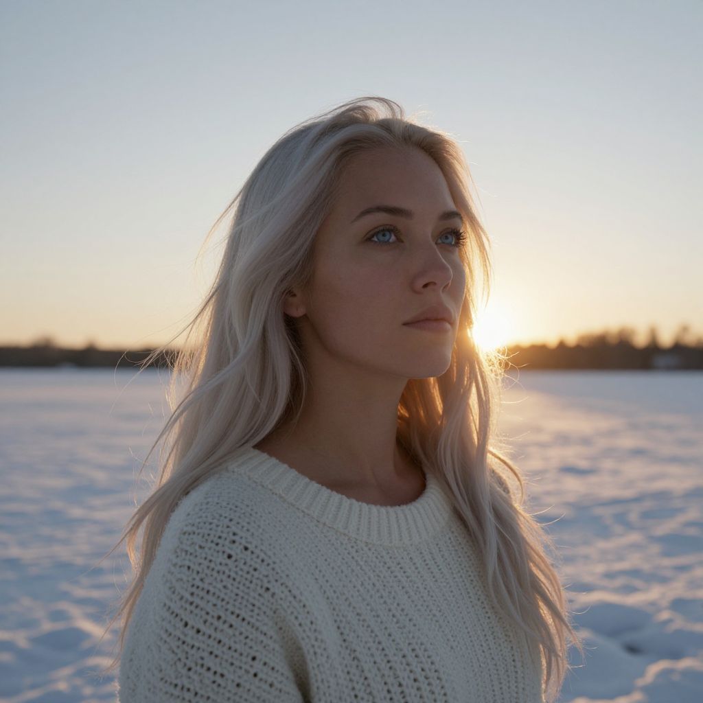 Photograph of a young blonde woman with long hair, wearing a white knitted sweater, standing in a snowy field at sunset.