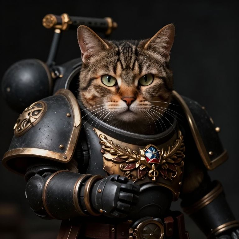 Plain portrait of cat as a primark from warhammer 40k holding, extremely detailed, hyper realistic, photoreal, epic, dramatic lighting, cinematic, atmospheric, complex, 4k,