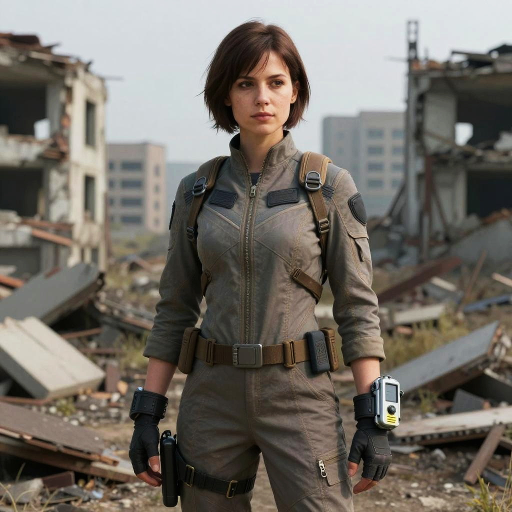 Photorealistic digital artwork of a determined young woman with short black hair, light skin, and a slender build, standing in a post-apocalyptic, ruined urban landscape. She wears a grey, zip-up tactical jumpsuit with black patches, brown belt, gloves, and a harness. Her right hand holds a handgun, while her left hand rests by her side. The background features collapsed buildings, debris, and a blurred, overcast sky. The image conveys a strong, resilient female protagonist in a war-torn environment. The lighting is natural, highlighting the textures of her outfit and the decay around her.