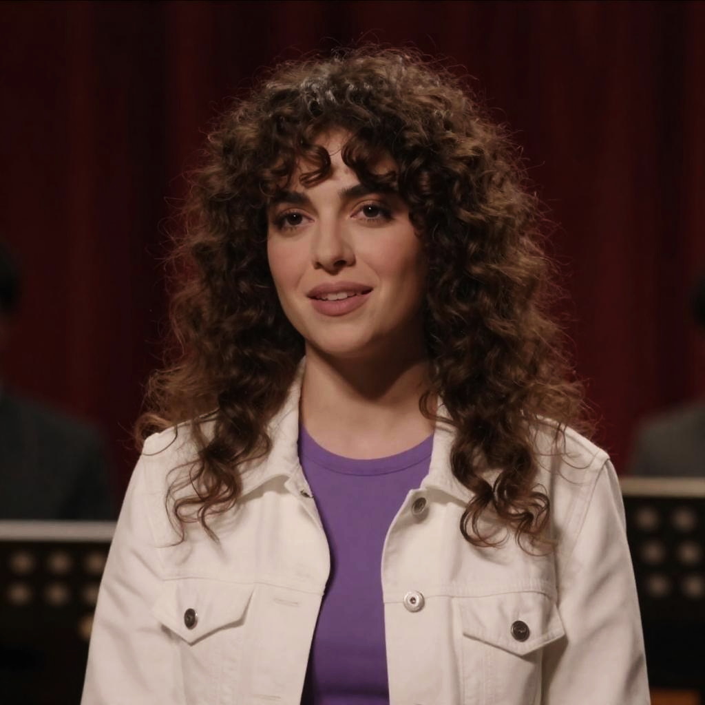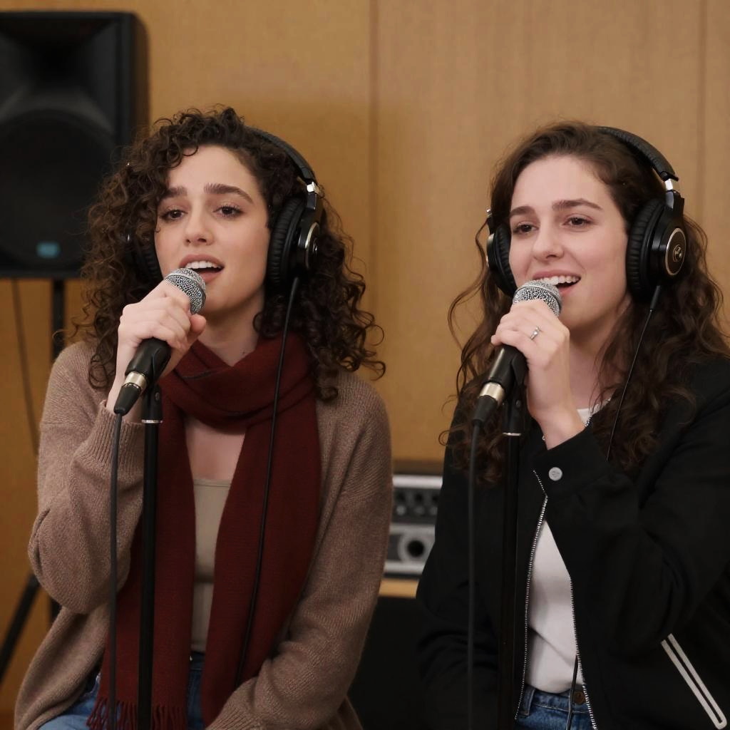 Two women with curly brown hair, wearing headphones, singing into a microphone. One in a brown cardigan and red scarf, the other in a black jacket with white accents. Both smiling. Background includes wooden panels and sound equipment.