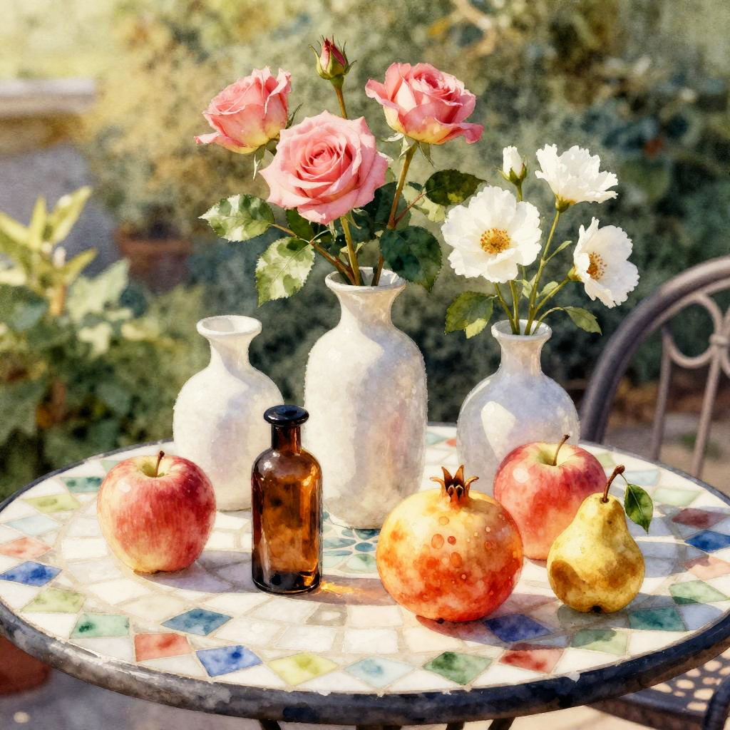Photorealistic watercolor, garden patio table with mosaic decorations, still-life featuring three white vases of varied shapes and a small brown bottle with a dark top; pink roses and white flowers with lively green leaves; fruits arranged around them: a red apple, a yellow-orange pomegranate, another red apple, and a small brown pear with a green leaf; gentle golden hour illumination; realistic textures, crisp edges, gentle reflections, soft falloff, color-true, editorial quality