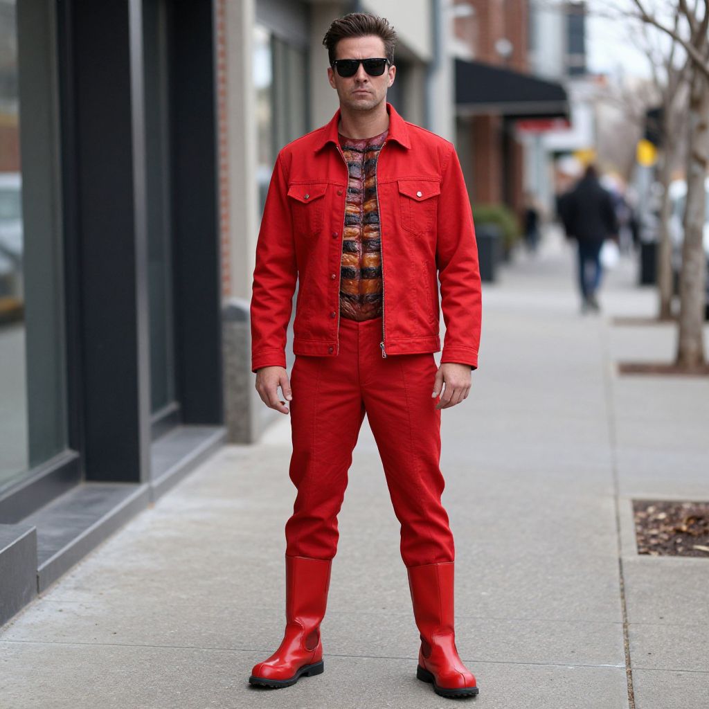 Photograph of a man in a vibrant red jacket, pants, and boots, wearing dark sunglasses, standing on an urban sidewalk.