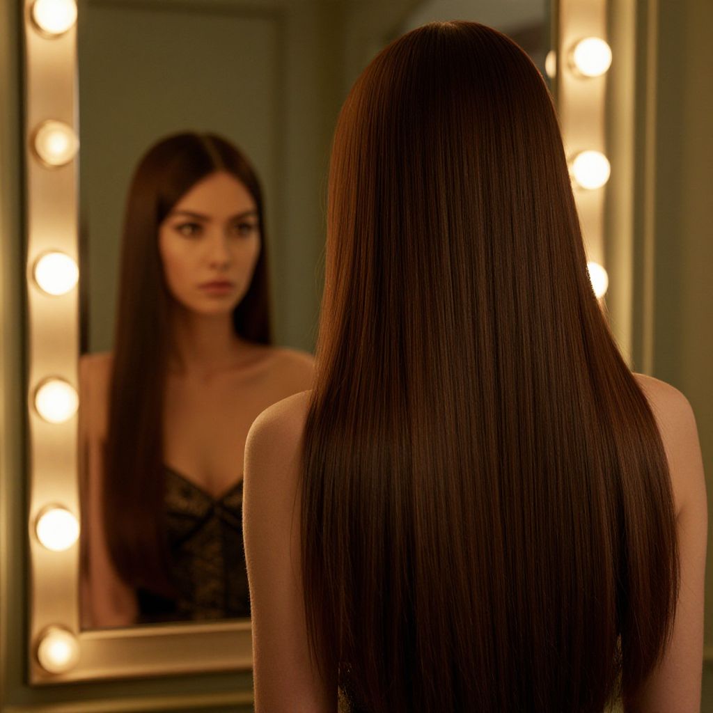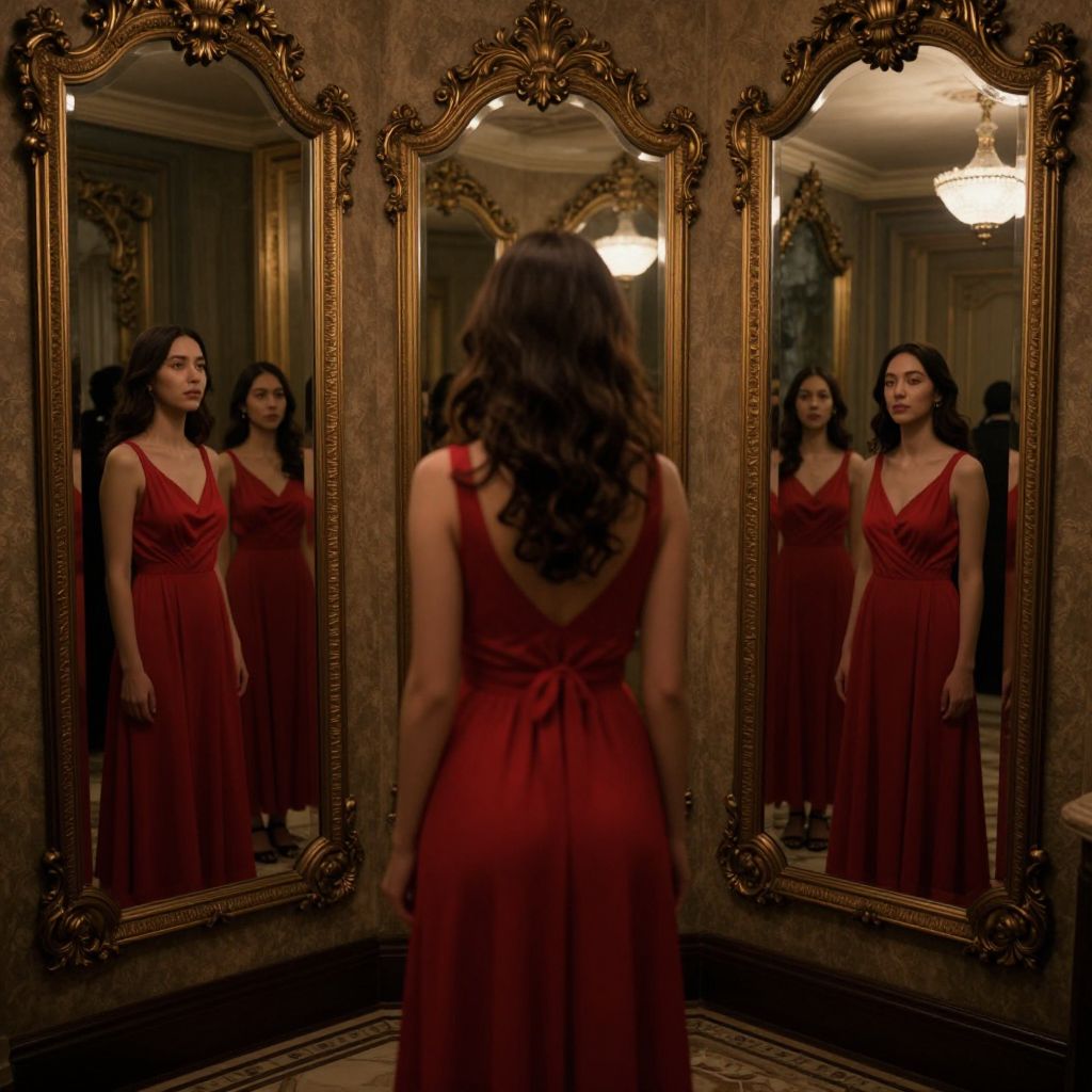 In a dimly lit, ornately decorated room, a photograph captures a woman with long, wavy brown hair standing with her back to three large, gold-framed mirrors. She wears a red, V-neck, floor-length dress with a bow at the back. The mirrors reflect her front view, showing her serene expression. The walls are covered in patterned, brown wallpaper, and a chandelier hangs from the ceiling. The floor features a black and white checkered pattern. The image has a dramatic, vintage feel, with rich colors and intricate details.