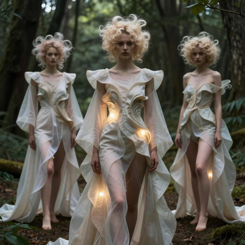 Avant garde clothes in an ethereal forest environment, flowing avant-garde fabrics with organic shapes, soft glowing lights, mystical ambiance, models with avant-garde hairstyles