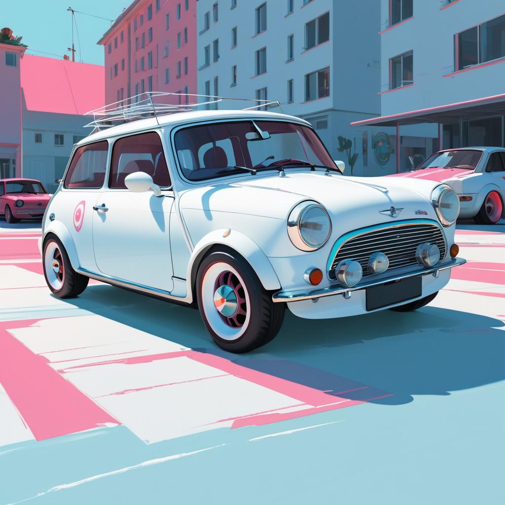 A stylish white Mini Cooper, no people, styled by Simon Stålenhag, Claire Wendling, with vibrant colors and comic cover art influences.