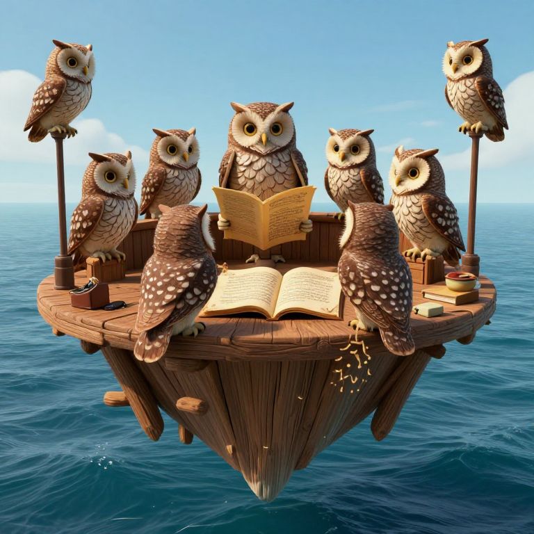 A digital illustration of six cartoon-style owls with brown and white speckled feathers, sitting on a wooden floating platform in a calm, blue ocean under a clear sky. Five owls are standing, one on each corner and one in the back, while the sixth owl sits centrally, reading an open, yellow book. The platform has wooden textures and small, scattered items, including a rolled-up scroll and a small lantern. The image has a whimsical, fantastical feel with bright, vibrant colors and a playful, imaginative atmosphere.