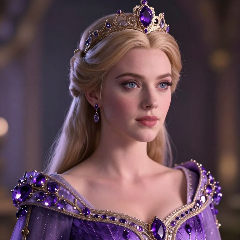 This is a CGI-rendered image of a young woman with fair skin and long, blonde hair, adorned with a gold and purple jeweled tiara. She has striking blue eyes and wears a purple, off-the-shoulder gown embellished with sparkling gemstones and gold trim. Her earrings match the tiara, featuring purple jewels. The background is blurred, featuring dark, warm hues, suggesting an opulent indoor setting. The lighting highlights her serene expression and the intricate details of her royal attire. The overall style is reminiscent of a fairy tale or fantasy theme.