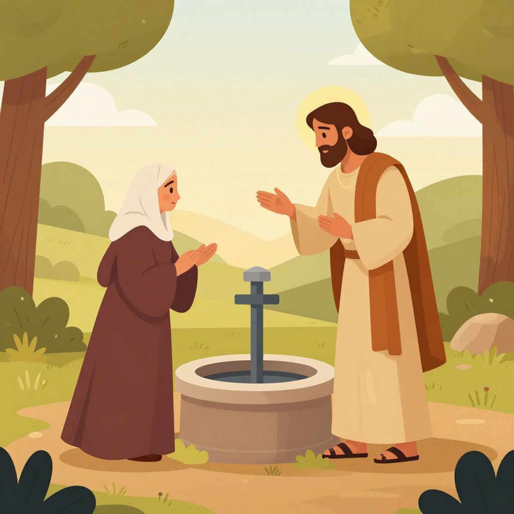A vibrant vector illustration depicts Jesus and the Samaritan woman at the well, rendered in a cartoon-style medium with warm, golden-hour lighting that enhances the serene and spiritual atmosphere of the biblical scene.