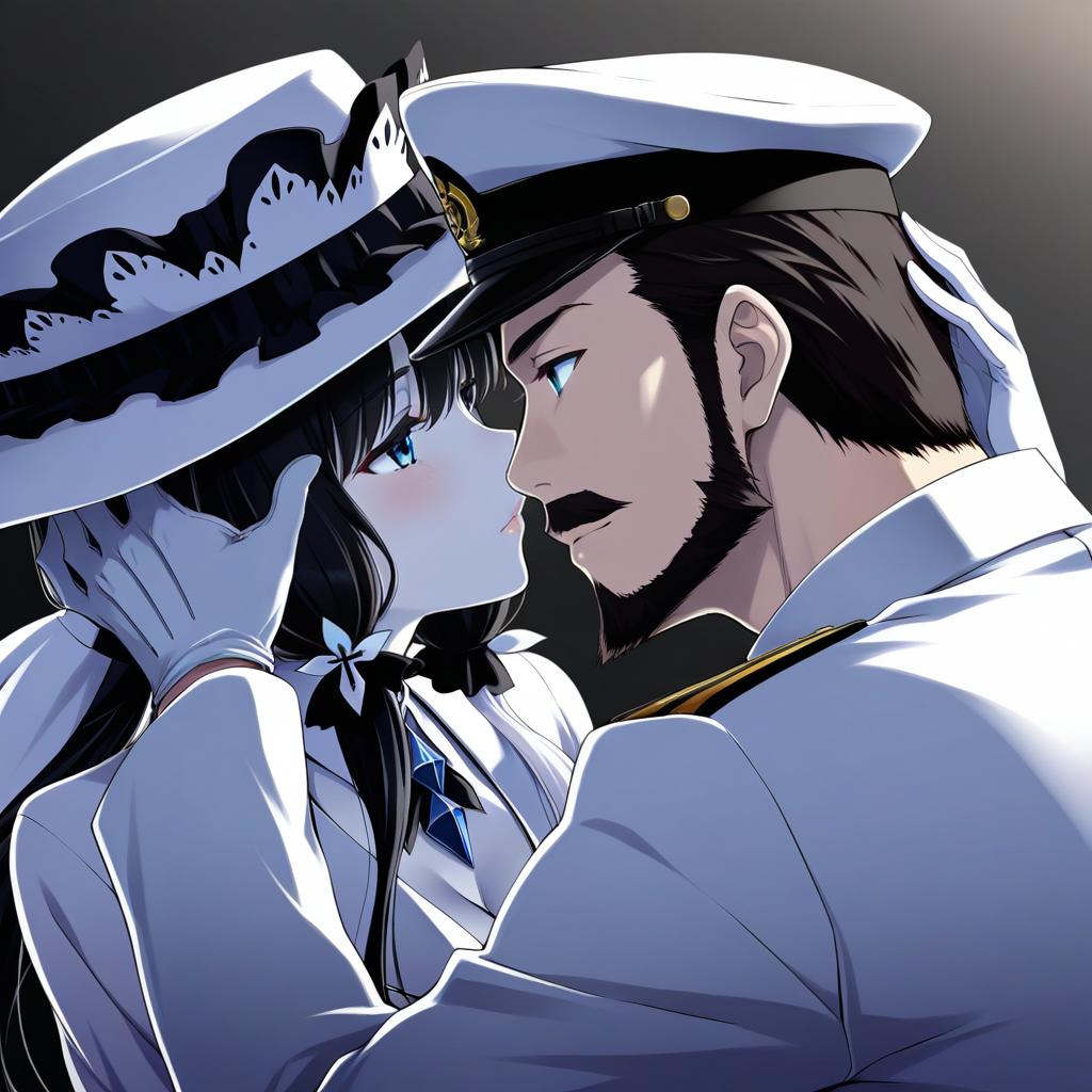 Digital anime-style illustration of a male admiral character with pale skin, black hair, mustache, and beard. He is wearing a detailed white naval uniform with gold buttons and a matching naval hat with a black brim. The character is depicted adjusting his hat against a soft, blurred background.