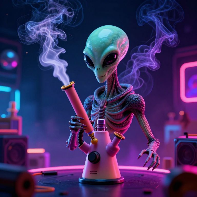 Alien smoking bong in a cosmic neon-lit room, colorful smoke swirling around, futuristic vibes, detailed extraterrestrial features, vibrant surreal atmosphere