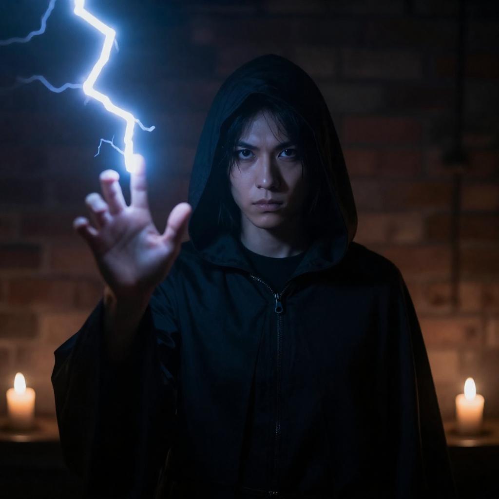 A dark, moody photograph of a hooded man with intense eyes, wearing a dark cloak, conjuring a bright, electric blue lightning bolt with his right hand. The background features a dimly lit, brick wall with flickering candles. The man's face is partially shadowed, adding to the mysterious atmosphere.