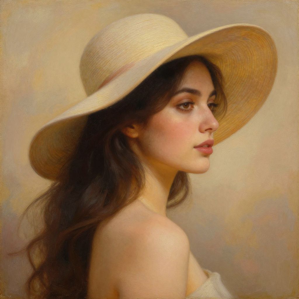 A stunning oil painting captures a woman adorned in a wide-brimmed hat, her dark, flowing hair cascading over her shoulders, bathed in warm, golden light that highlights her serene expression and elegant profile.