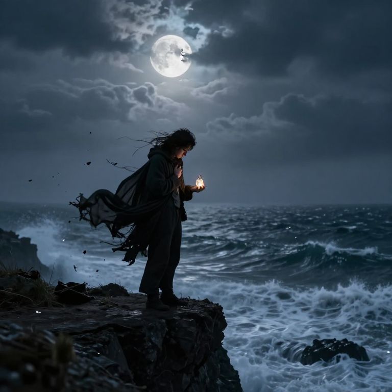 A digital illustration depicts a lone, silhouette figure standing on a rocky cliff under a full moon. The figure, with long, wind-swept hair, wears a tattered cloak and holds a glowing, white flame in their hand. The tumultuous ocean waves crash against the rocks below, illuminated by the moonlight. Dark, stormy clouds partially obscure the bright moon, casting a blue-gray hue over the scene. Birds are scattered across the sky, adding to the dramatic atmosphere. The overall mood is mysterious and melancholic, with a strong contrast between the dark foreground and the luminous background.