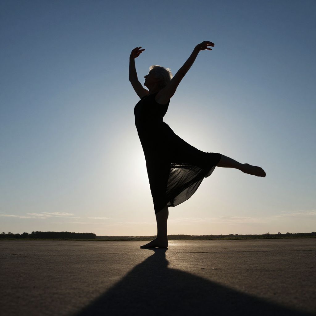 Silhouetted dancer in flowing dress, arms raised, sun behind, casting long shadow, against clear blue sky, on expansive open ground.