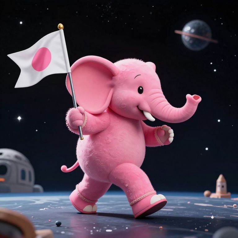 Cinematography From Music Video A pink elephant walks in space wearing high heels and holding a flag,