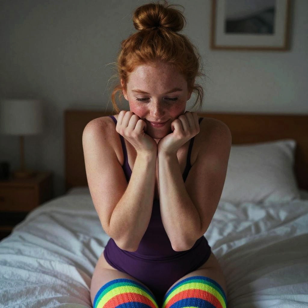 Busty Excited Blushed spanish Woman in leotard and colorfull neon Striped knitted wool stockings, Red blonde hairbun, freckles, shy Smile, offering Herself, nice scandinavian bedroom at night, dimmed light, shy Look from Beneath with soft lighting, inviting decor, RAW photo, (high detailed skin:1.2), 8k UHD, DSLR, soft lighting, high quality, film grain, Fujifilm XT3, RAW candid cinema, 16mm, color graded portra 400 film, remarkable color, ultra realistic, textured skin, remarkable detailed pupils, realistic dull skin noise, visible skin detail, skin fuzz, dry skin, shot with cinematic camera, feminine expressions