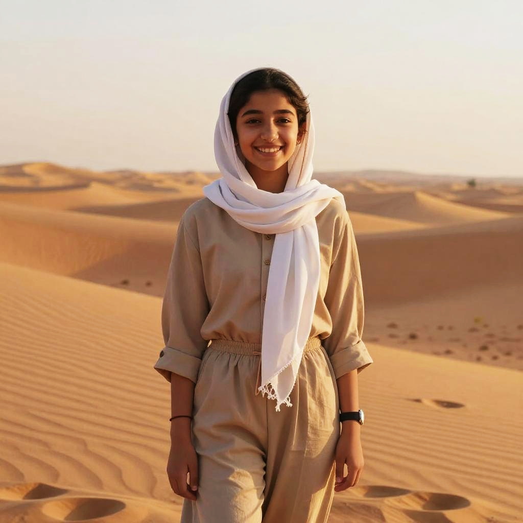 Photograph of a smiling young woman with medium brown skin, wearing a beige traditional outfit and white scarf, standing in a sunlit desert with golden sand