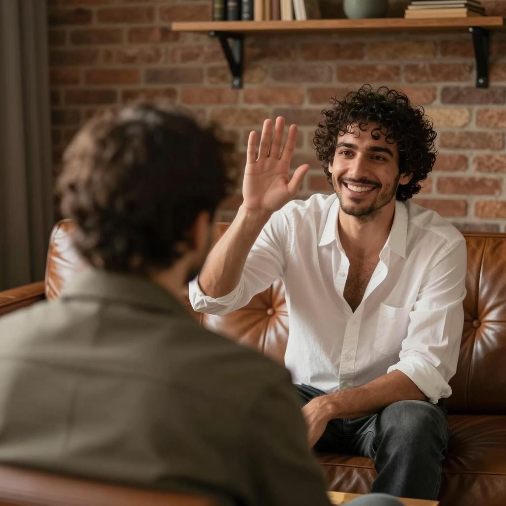 Restaurant scene with five men at a table. Bald man in black shirt pouring drinks, standing. Four seated men: one with curly brown hair, blue jacket, eating; one with gray hair, white shirt, black tie, looking down; one with dark hair, white shirt, black tie, looking at gray-haired man; one with brown hair, partially visible. Green tablecloth, cups, plates, drinks. Background: kitchen, other customers, potted plants, framed pictures, window.