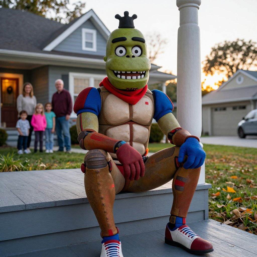 High-resolution photo of Mike Myers dressed as the Halloweentown version of the 'Freddy Fazbear' character, wearing a colorful costume with red and blue patches, a red scarf, and a large green mask, sitting on a wooden porch in a suburban American house during golden hour with family in the background.