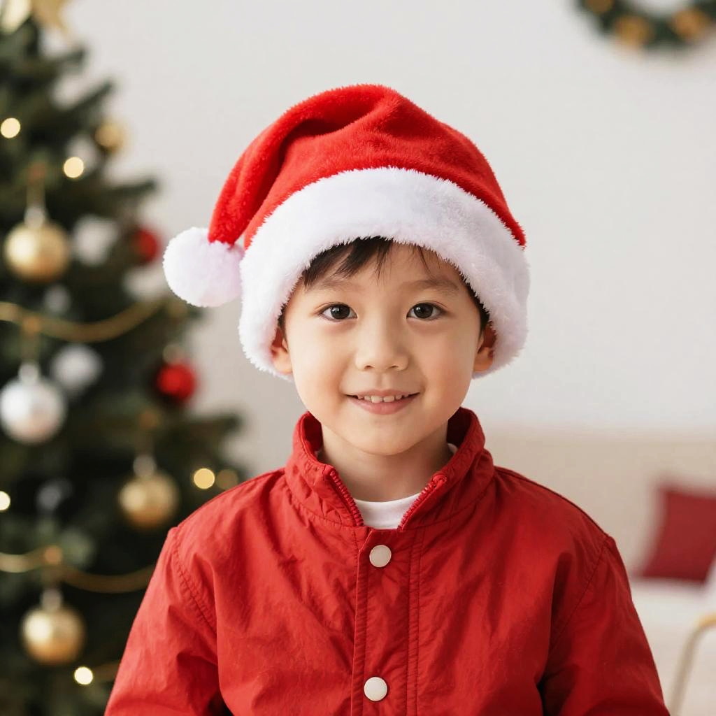 Photograph of a young Asian boy with short black hair, wearing a red Santa hat with white trim and a red puffer jacket with a black zipper. He has a slight smile and brown eyes, looking directly at the camera. The background is pure white, making the boy and his festive attire stand out prominently. The texture of the puffer jacket is soft and quilted, contrasting with the smooth fabric of the Santa hat. The image has a bright, cheerful, and festive feel.