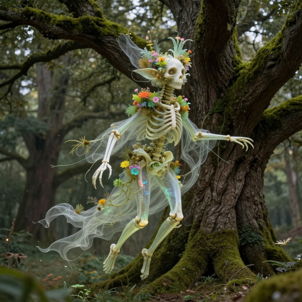 A translucent, skeletal forest spirit hovers playfully in front of a towering, ancient oak, its gnarled bark draped in lush green moss, This ethereal being embodies the spirit of the woodland, with a skeletal frame resembling an otherworldly creature, reminiscent of a gentle giant or a fey animal, Its elegant bones shimmer with a soft green luminescence, casting a serene glow around it, The spirit’s form is wispy yet distinct, with delicate, ghostly tendrils resembling vines cascading from its skeletal structure, intertwining with the vibrant flora that surrounds it, Intricate patterns of shimmering blue and iridescent green dance across its bones, mimicking the flourishing plants that thrive nearby, Its hollow eye sockets glimmer faintly, suggesting a profound connection to the forest's life force, while small, glowing herbs and whimsical flowers sprout directly from its bones, infusing the scene with vibrant colors, As it floats, tiny spores drift around it like playful fireflies, enhancing the magical atmosphere, This skeletal forest spirit exudes a warm, nurturing energy, embodying the delicate balance of life and decay within the woods, It stands as a guardian of nature’s secrets, inviting all to share in its enchanting presence and embrace the wonder of the forest