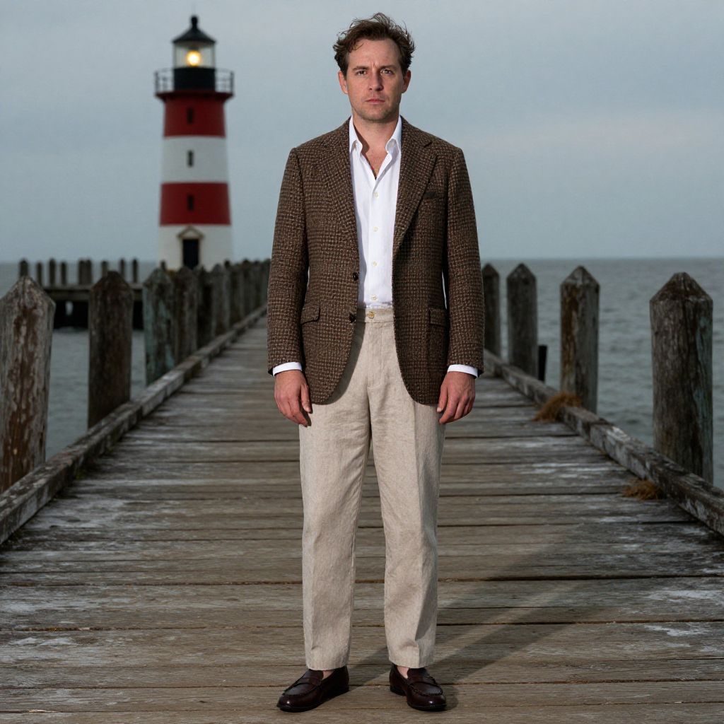 A man, brown houndstooth check suit, textured linen blazer, beige cotton trousers, white button-down shirt, dark brown leather loafers, historic lighthouse, weathered wooden piers, oversaturated film, contemplative expression Man has masculine face and piercing eyes