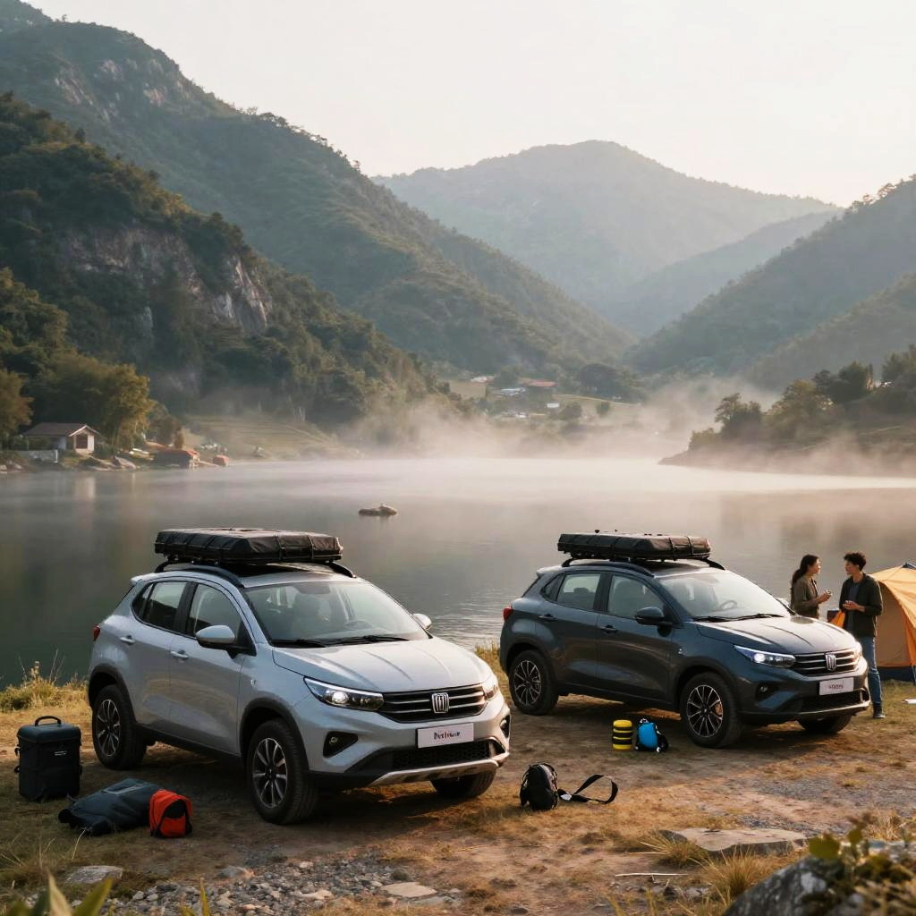 Fiat weekend adventure, modern Fiat cars parked near mountain lakeside, camping gear around, people having fun, early morning mist, crisp and clear landscape photography