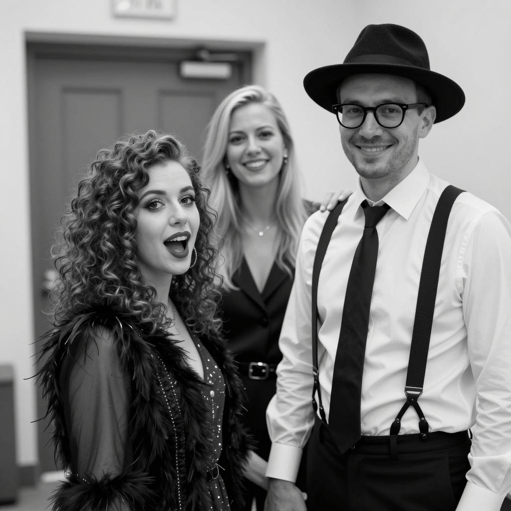 Black and white image of a live jazz performance featuring a female singer in a sparkling sequined dress with curled hair singing into a microphone. Two male saxophonists in dark suits and hats play saxophones in the background with focused expressions.