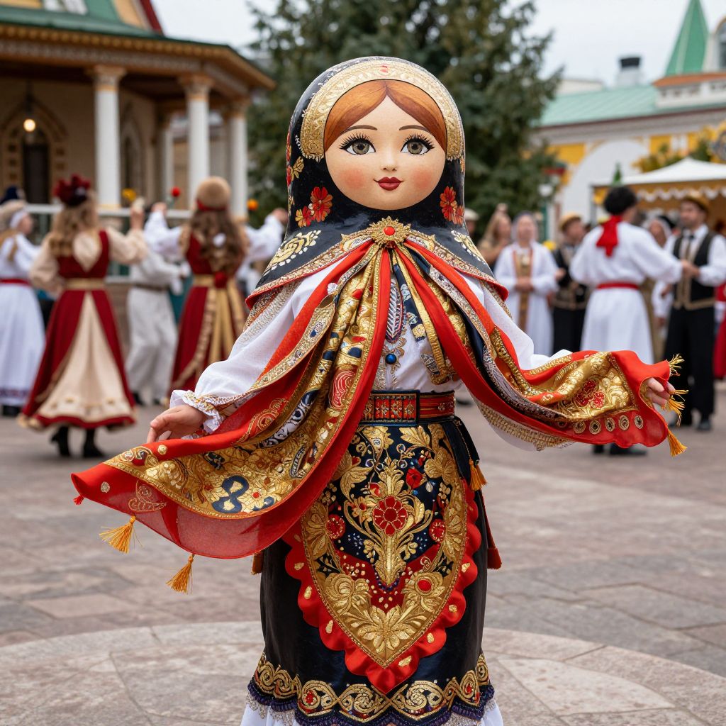 A vibrant, high-resolution photograph of a woman adorned in a Russian matryoshka doll costume, with a strong, radiant face, full lips, and bright hazel eyes, wearing a beautifully layered scarf with patterns of gold and crimson that flow dynamically across her body, standing on a stone platform in a traditional Russian courtyard during a festival, with dancers in the background, highlighting the iconically layered scarf and cultural authenticity of the costume.. The woman has big tits and cute face