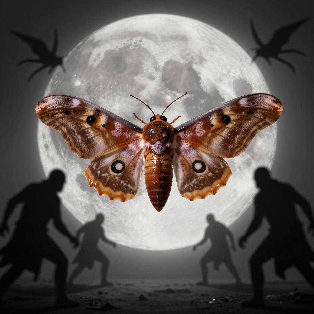 A detailed hyper-realistic giant moth with caramel tones and intricate wing patterns flying in front of a large full moon. The scene is set at night with a dark, greyscale background, featuring shadowy silhouettes of armed assassins poised in dynamic action stances on the ground. The image evokes a mysterious and eerie atmosphere, enhanced by volumetric lighting and a powerful, cinematic composition.